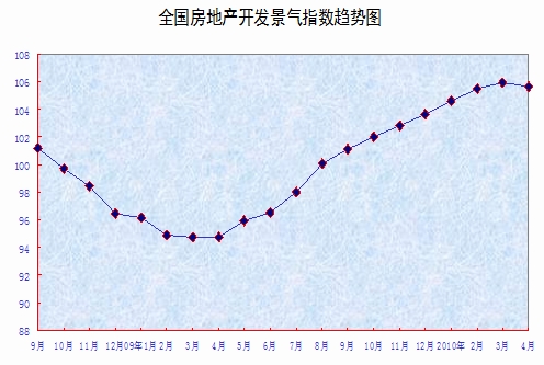 中新網5月11日電 據統計局網站消息,4月份,全國房地產開發景氣指數(簡稱“國房景氣指數”)為105.66,比3月份回落0.23點,比去年同期提高10.90點。