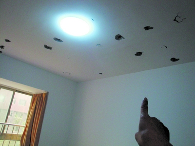 12月7日中午,在物業(yè)公司服務(wù)的王小姐走進(jìn)租住的岳麓區(qū)西岸潤澤府小區(qū)6棟307房,立即發(fā)出一聲尖叫,她發(fā)現(xiàn)自己本來干凈整潔的床鋪上散落著大大小小的水泥塊,而本來光潔白亮的天花板出現(xiàn)了幾十個洞。“當(dāng)時第一感覺以為是發(fā)生了地震。細(xì)數(shù)發(fā)現(xiàn),竟有29個洞。”合租的一男孩子告訴記者。后來大家明白了,這是樓上裝修引起的問題。