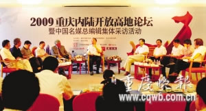 昨日,“2009內陸開發高地論壇”在我市舉行,國內十家知名媒體的總編輯應邀到會,他們包括了南方周末總編輯向熹、第一財經日報總編輯秦朔、21世紀經濟報道總編輯劉洲偉、中國新聞社社長劉北憲、新浪網總編陳彤、中國周刊執行社長朱德付、新京報總編輯戴自更、新聞出版報社長姜軍等。老總們集體采訪了市委常委、常務副市長黃奇帆,請他闡釋“重慶怎樣才算建成內陸開放高地”,黃奇帆回答說:“我個人認為,將來重慶成了長江上游的經濟中心、金融中心和貿易中心,內陸開放高地就算建成了。”