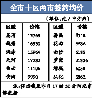 在全市十區兩市中,依舊是荔灣、越秀、海珠、天河、白云、蘿崗六區簽約均價過萬元/平方米。其中,截至昨日17時30分僅簽約23套的蘿崗區簽約均價達21836元/平方米,全市最高,比9月漲近49%,而這與其簽約的多是大面積豪宅有關,其平均每套簽約面積達188平方米,為全市最大。