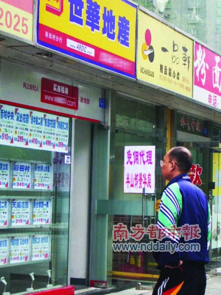 剛看到世華地產彩田村分行門口“免傭代理半山御景華庭”的告示時,記者還以為是二手樓,因為只有買二手房才需要付給中介公司傭金。采訪之后才知道,原來“免傭”的說法是相對中介公司而言的。“一般來說,在中介公司放盤的都是二手房,交易達成后中介向賣方雙方各自收取房款1.5%的傭金,而現在我們這里放盤的半山御景華庭是一手新樓,我們作為中介代理方帶客戶過去購買,對買家是不收取任何中介費用的,而是開發商給予我們傭金提成。”該店鋪經紀人陸先生解釋道。