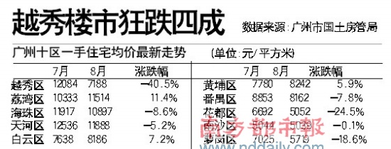 廣州越秀區(qū)房?jī)r(jià)大跳水,一手住宅均價(jià)從今年7月的12084元/平方米猛跌至7188元/平方米。廣州市國(guó)土房管局調(diào)查指出,越秀區(qū)房?jī)r(jià)大幅下降是由兩個(gè)低價(jià)樓盤的集中交易造成的,專家稱可能涉及內(nèi)部交易。而廣州市日前公布的最新房地產(chǎn)市場(chǎng)分析報(bào)告顯示,廣州全市十區(qū)8月一手住宅均價(jià)小幅下降至9078元/平方米。