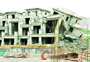 受金融風暴影響,東莞虎門一樓盤建筑面積約600平方米的大戶型別墅出現銷售困難的窘態。為盤活市場,該樓盤前兩日開始將一套已完成整體框架結構的大戶型別墅拆除,預計要拆除類似別墅共15套。