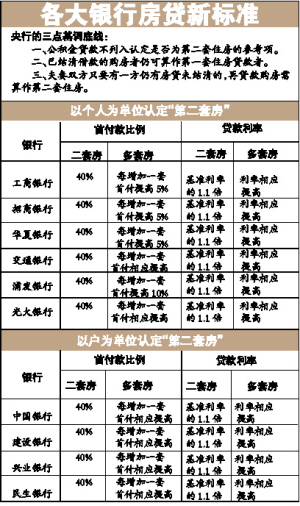 在已出臺具體房貸細則的銀行中,招行、浦發、華夏對已結清余額的購房者再購房的情況下,仍等同于首套住房。但是光大銀行較為嚴格,即便此前的房貸已還清,再貸款買房仍被視為第二套房,首付不少于40%,利率不低于同期同檔次貸款基準利率的1.1倍。