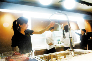 廚房里的布局是按照食品的貯存和準(zhǔn)備、清洗和烹調(diào)這一操作過程安排的,應(yīng)沿著三項主要設(shè)備即爐灶、冰箱和洗滌池組成一個三角形,安置最合宜的距離以省時省力。據(jù)專業(yè)人士介紹,這三邊之和應(yīng)以0.45-0.67米為宜,過長和過小都會影響操作。在操作時,洗滌槽和爐灶間的往復(fù)最頻繁,因此廚房專家建議應(yīng)把這一距離調(diào)整到1-2米之間較為合理,讓使用者在拿取與放置食品時不會太近或太遠(yuǎn),在轉(zhuǎn)身時也不會顯得局促。需要注意的是,放置冰箱的位置不宜靠近灶臺,因為后者經(jīng)常會產(chǎn)生熱量,而且又是污染源,這將影響冰箱內(nèi)的溫度。同時,冰箱也不宜太接近洗菜池,避免濺出的水導(dǎo)致冰箱漏電。