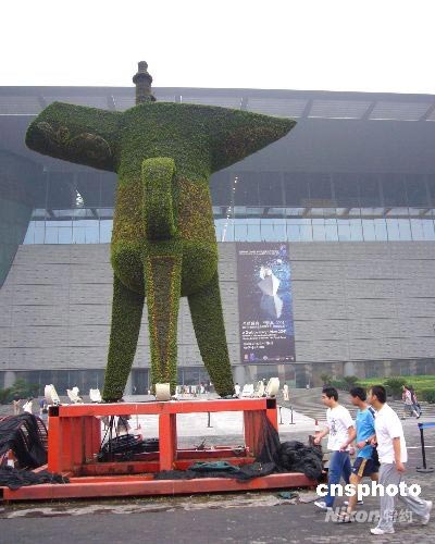 6月29日,一尊高約8米的 “巨鼎” 亮相北京長安街頭。這尊“巨鼎”是由綠色植被塑成的,為即將到來的北京奧運會增添了獨特的韻味,吸引過路行人側目。 中新社發 玉龍 攝