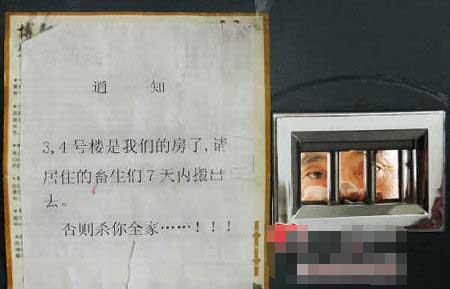 該小區(qū)物業(yè)辦工作人員說,十天前,小區(qū)里突然出現(xiàn)了十幾張通知,落款未寫單位,但內(nèi)容很恐怖:如果三、四號(hào)樓的住戶不搬家,就殺他全家。“整個(gè)小區(qū)的人都人心惶惶的,特別是三、四號(hào)樓的200多個(gè)住戶,日夜守在家里,生怕沒人的時(shí)候房子被人強(qiáng)占。”該工作人員說。