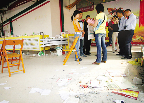 從當日上午10時至下午2時,不少業主聚集在售樓部內,要求開發商給個明確答復,一直未能如愿。一些業主撕碎了文件,甚至把售樓部的椅子扔到門外。為此,轄區民警曾兩度趕到現場維持秩序。