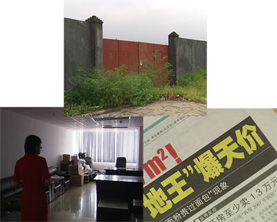 2007年9月11日,保利地產在一天之內以8769和8112的高昂價格,拿下了這里的兩塊土地,成為地王。現在土地已經被鐵皮墻包圍起來。大門門口雜草叢生,看起來很少有人光顧。我們找到了看守工地的施工人員。