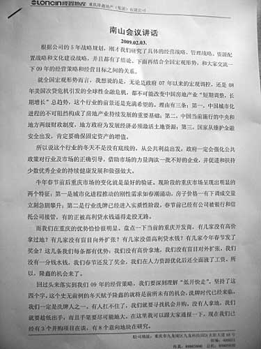 昨日,重慶一網(wǎng)友自稱貼出隆鑫地產(chǎn)一份高層內(nèi)部南山會(huì)議講話稿的照片,其稱在春節(jié)后,隆鑫地產(chǎn)欲對(duì)旗下樓盤降價(jià),以期快速回籠資金去買地?cái)U(kuò)張規(guī)模。從內(nèi)容上看,講話者像是為隆鑫降價(jià)做動(dòng)員工作,表明降價(jià)的目的是快速回籠資金并擴(kuò)大規(guī)模。網(wǎng)友在跟帖中稱,萬科松山湖會(huì)議紀(jì)要事件驚現(xiàn)重慶版,隆鑫降價(jià)講話遭網(wǎng)絡(luò)泄密。隆鑫地產(chǎn)一位不愿意透露姓名的高層告訴記者,內(nèi)部正在追查泄密者。