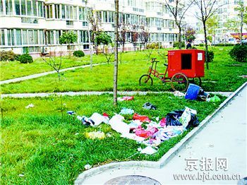 記者昨天上午11時趕到華龍苑北里小區,發現小區門口沒有一個保安,任何人都可以隨便進出小區。更意外的是小區里很少見到垃圾桶,草坪上隨處可見居民亂扔的垃圾。