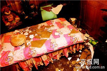 李先生心有余悸的告訴記者,“接著我就走進了臥室,看到房頂的水泥三分之二都掉了下來,再看地上都是碎片和渣土。幸好昨天我睡覺睡得晚,要不這要給砸著……嚇得我和我愛人一晚上都沒睡好覺。”