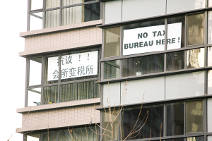 半年來,得知地區(qū)稅務所即將進駐小區(qū)會所后,朝陽區(qū)金地國際花園的業(yè)主多次向開發(fā)商、CBD管委會反映情況,但收效甚微。部分業(yè)主在自家窗上貼上標語以示抗議。