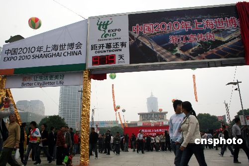 十月二十五日,中國2010年上海世博會倒計時919天之際,世博會倒計時電子鐘在杭州武林廣場揭幕。這是中國申辦世博會成功后,首個在上海市以外地區設置的倒計時電子鐘,這標志著這一屆由中國主辦、上海承辦的世界博覽會將與長三角地區對接。長江三角洲的浙江、江蘇兩省將聯合上海共同迎接這一“國際經濟、科技、文化的奧林匹克”盛會。中新社發 許曉青 攝