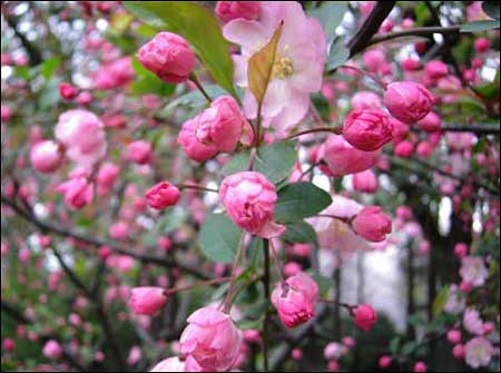 海棠:海棠花姿瀟灑,雅俗共賞,素有“花中神仙”“花貴妃”之稱。明代《群芳譜》記載,海棠有四品,指的是西府海棠、垂絲海棠、木瓜海棠和貼梗海棠。植物園內這幾種海棠都有種植,目前已大量開放,有粉紅、鮮紅、粉白等多種花色。