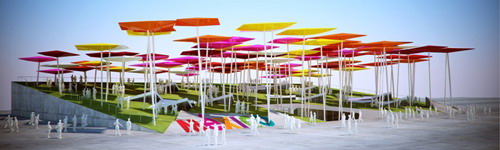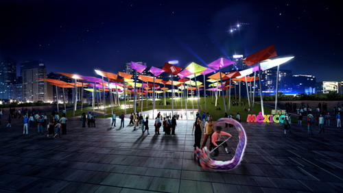 風(fēng)箏廣場是墨西哥館的核心。風(fēng)箏在nahuatl語(民族方言)的名稱是“papalotl”,也就是西班牙語中的蝴蝶。風(fēng)箏是連接墨西哥文化和中國文化的一個(gè)要素。參觀者可以在墨西哥館里購買風(fēng)箏,或者親手做一個(gè)風(fēng)箏,然后在風(fēng)箏廣場上放飛。由風(fēng)箏組成的森林代表著墨西哥人對未來的期待,廣場上的人造綠草表達(dá)了墨西哥人對城市綠地的關(guān)注。人們可以在綠地上進(jìn)行各種活動,諸如讀書、野餐或是在陰涼處隨意地休憩;綠地上空,風(fēng)箏在飛翔。
