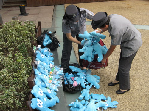 在南京路步行街管理辦牽頭下,黃浦區(qū)城市管理監(jiān)察大隊(duì)開(kāi)展了對(duì)南京路步行街各類無(wú)證設(shè)攤的打擊,一天之內(nèi)就收繳了200余只假冒海寶玩具。這是城管部門在與上海世博局建立聯(lián)動(dòng)機(jī)制后,首次收繳侵犯上海世博會(huì)知識(shí)產(chǎn)權(quán)標(biāo)志的商品。