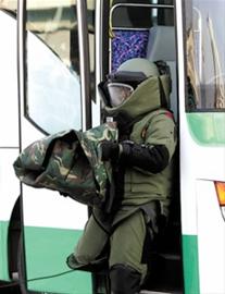 消防特勤官兵正從旅游巴士上搬下可疑物。昨天,上海旅游業突發事件應急演練在外高橋皇冠假日酒店舉行,可疑物排除是演練的內容之一。 邵劍平 攝
