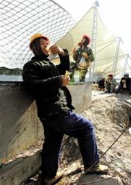 老葛告訴記者,一年前他剛“混”進園區,不是賣燒酒,而是賣啤酒。夏日炎炎,有個世博軸上的江蘇技工幾乎每天都來光顧,喝啤酒就像喝水一樣。江蘇工人喝多了,話也多。他告訴老葛,自己成天吊在繩索上,趴在上面倒騰的“大喇叭”,叫陽光谷。