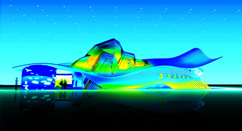 記者在現場看到,盡管尚需細化,但剛剛誕生的山東館已顯示出不凡魅力。展館占地600平方米,最高處約9米,以藍色為主色調,突破了以往展館四墻合圍的方正常規,外觀將大海的浪涌和雄峙的泰山融為一體,流暢的曲線勾勒出山東“海岱交融”的地理形勝,表達出“青山連綿不絕,綠水長流不斷”的文化意境。