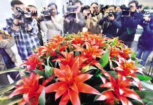 “中國紅”是鮮花港科技興市重大攻關項目的最新成果。這一鳳梨花新品色澤純正花型飽滿,葉片大花期長,環境適應性強,是較理想的室內用花。(薛慧卿 孫中欽)