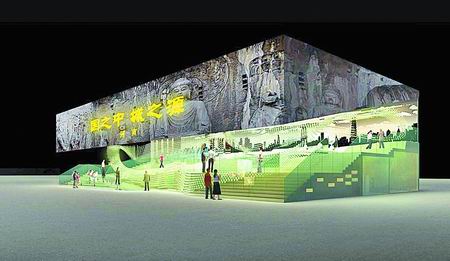 河南館的建筑外形由一個“中”字變形而來,分上中下三層空間,其中中部構成一個全開放的坡面空間,為展館主體,上層主要是穹頂裝置,下層則設計為一個藏寶室。正面是“國之中、城之源”及“河南”幾個大字;側面,盧舍那大佛微笑了千年的龍門石窟,觀之令人震撼。展館主體空間,由數千個文物復制品、人物模型組成了一個實體的、起伏綿延的游行隊伍,仿佛是一場流暢的盛大演出。據了解,上海世博會河南館正在加緊裝修布展,各種展品正陸續運往上海,參展文物和大游行人偶4月10日~15日安放到位,4月15日~20日試運行,4月20日后將隨中國館試運營。昨天,河南世博辦還向記者解讀了河南館的五大亮點。