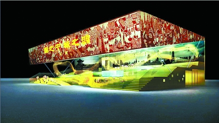 據介紹,河南館的建筑外形由一個“中”字變形而來,分上中下三層空間,其中中部構成一個全開放的坡面空間,為展館主體,上層空間主要是穹頂裝置,下層空間則設計為一個藏寶室。展館主體空間,也就是中部的坡面空間,各展項依照“河南城市文明的盛大游行”概念,按時代順序組織排列。在設計上,除了各項多媒體裝置在內容上的呼應支撐外,還由數千個文物復制品、人物模型組成了一個實體的、起伏綿延的游行隊伍,再加上繽紛變化的燈光效果,整個主體空間呈現給人的仿佛是一場盛大演出。