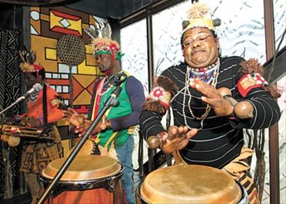 餐廳內用非洲圖騰繪制成彩色墻面,由鴕鳥蛋做成精致吊燈,樹枝和草帽拼接裝飾屋頂,頗具非洲原生態氛圍。餐廳二樓設有一個小舞臺,就餐時,身著非洲傳統民族服飾的非洲團隊還會在舞臺表演。(鐘怡 徐蒙)