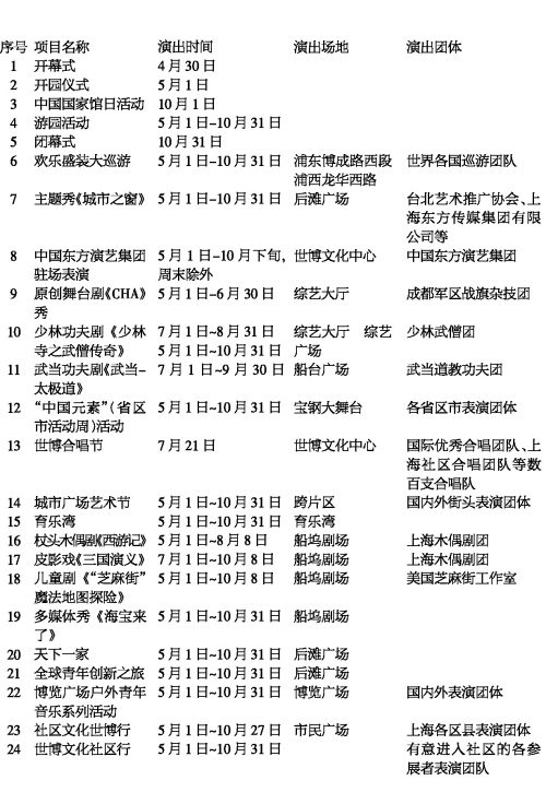 上海世博會(huì)期間,世界各地表演團(tuán)體將帶來2萬多場(chǎng)文藝演出和活動(dòng)。由東道主組織的19項(xiàng)盛大演出也已準(zhǔn)備就緒,開幕第一天起陸續(xù)在世博園全新的文化中心、綜藝大廳、綜藝廣場(chǎng)、后灘廣場(chǎng)、船臺(tái)廣場(chǎng)、寶鋼大舞臺(tái)、育樂灣、船塢劇場(chǎng)、博覽廣場(chǎng)、市民廣場(chǎng)一一亮相,生動(dòng)演繹各國傳統(tǒng)和文化,盛情邀請(qǐng)各國來賓分享和互動(dòng)——