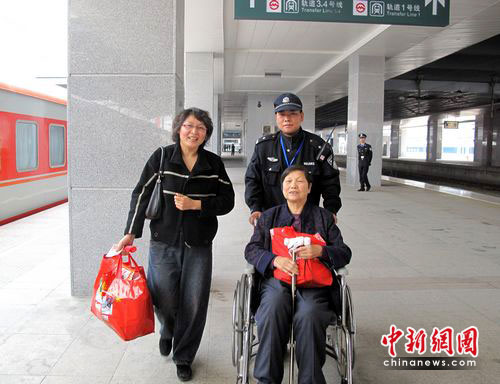 中新網徐州4月24日電 (耿晴 張良燦 侯啟光)“您好,我是上海鐵路民警,請問要到哪去?輪椅我來幫您推! ”在上海火車站6號候車室,來自徐州鐵路公安處援滬安保民警邊詢問邊接過一旅客手中的輪椅。“麻煩您幫忙了,我媽身體不好只能坐輪椅,謝謝!”身后,一位拿著兩個大包裹的中年女性旅客連連道謝,民警會同世博志愿者一直將老人送上了列車。