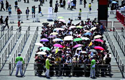 昨日的安檢中,很多游客需開(kāi)包檢查,相機(jī)、筆記本電腦需現(xiàn)場(chǎng)開(kāi)機(jī),延長(zhǎng)了安檢時(shí)間。安檢人員說(shuō),游客可以帶傘遮陽(yáng),但最好不要帶防曬霜等化妝品。