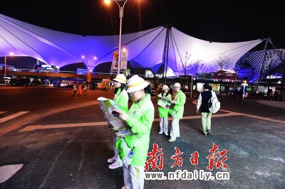 在“明星”云集的世博展區(qū),志愿者的光芒顯得非常薄弱,但他們就像漫天繁星一樣散布在園區(qū)各個(gè)角落里,照亮了夜空。