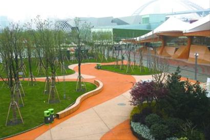 世博公園在新材料、新技術上的應用也走在現有大型綠地的前列。整座公園沒有使用一根原生木材,一塊原生石材,全部采用再生材料來替代,體現未來“綠色城市”的理念。