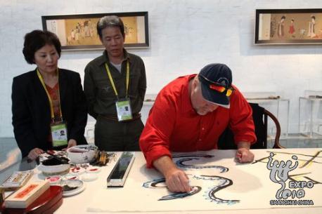 除制瓷以外,參觀寶鋼大舞臺的外國游客還常常熱衷于剪紙、織錦、皮影、旗袍等中國傳統文化,常常盯著一件作品看上老半天,如果碰巧遇上創作演示,更是不看到成品不罷休。每逢這時,獻藝的各位工藝大師總是會熱情地邀請他們親自試一試,剪下一朵花,或畫下一尾魚,體驗中國文化的奇妙。大師們頗有心得地說,語言不是障礙,微笑就是最好的溝通。