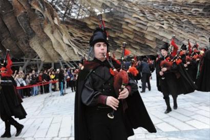 昨天(17日)下午,50位穿著十八世紀傳統服裝的風笛手在西班牙國家館的廣場上演奏傳統音樂,開啟了世博會西班牙國家館加里西亞周的活動。