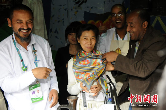 非洲聯合館管理部部長陳錦田為張根囡配帶上限量版的榮譽徽章,并向她贈送非洲聯合館出版的《非常非洲》、《非洲故事》兩本書的首冊。埃塞俄比亞參展總代表Sisay Getachew還邀請她到埃塞俄比亞展區品嘗咖啡,并親自為其佩戴當地圍巾。