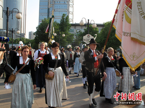 中新網南京5月23日電(申冉 閆正偉)今天下午,南京市中心山西路的市民廣場上空飄蕩著來自奧地利美麗山崗原野間的優美圓舞曲,穿著奧地利民族服裝的奧地利施瓦茨市長樂團樂手們帶著他們淳樸悠揚的旋律和歡快自由的舞步,給南京市民送來了一個充滿著奧地利音樂狂歡節日氣氛的初夏周末。