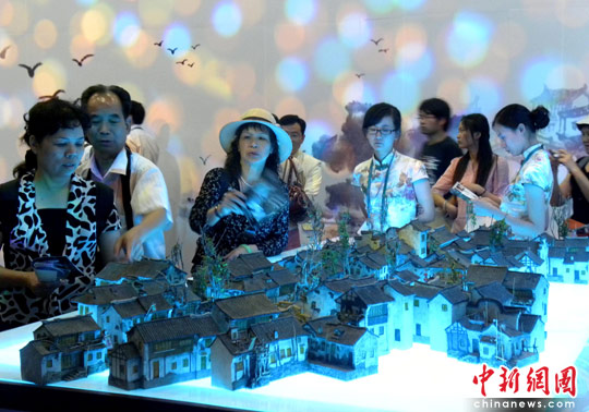 整個(gè)案例詮釋了周莊在古鎮(zhèn)保護(hù)、環(huán)境建設(shè)和開發(fā)利用方面的成就,通過(guò)視頻演示、活態(tài)表演、水幕浮雕、論壇等多種形式,生動(dòng)多角度展現(xiàn)“小橋流水人家”的江南獨(dú)有風(fēng)韻和美好生活。在約五百平方米的案例展區(qū)內(nèi),分為“中國(guó)第一水鄉(xiāng)”、“我愛周莊”、“周莊是國(guó)寶”三個(gè)篇章。步入展區(qū),就猶如身處一幅緩緩打開的畫卷中:眼前波光流翠、粉墻黛瓦、翠竹搖曳、庭院疊嶂,阿婆茶、手編竹、繡花鞋等手工藝表演盡顯婉約吳地人文風(fēng)情;踏入長(zhǎng)廊,煙波浩渺盡收眼底;穿過(guò)拱門,臨坐美人靠,古園風(fēng)情、江南田園風(fēng)光旖旎;古戲臺(tái)上昆曲表演,水袖飄逸賞目、天籟之音悅耳;虛實(shí)結(jié)合的名景雙橋,頭戴斗笠、身著水鄉(xiāng)服飾的江南女子,一切美不勝收。