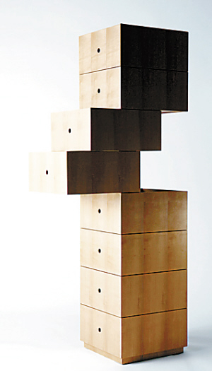 這個由女設計師Tadao Hoshino設計的“異形”抽屜組合,靈感來自于一位女性不斷膨脹的儲物愿望。同為女性,女設計師Hoshino比任何人都明白女士們總會不斷購買服飾而讓自己的抽屜不堪負荷。這個組合家具共有八個相同的抽屜,雖然每個抽屜的樣子并不特別,只是四方的木質抽屜,然而每個抽屜的排列方式卻很特別,形成了一種組合的趣味。(陳薇薇、陳晶晶)