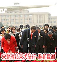 ·宋楚瑜家鄉先祖墓葬完好如初 祭祖儀式共分九步 ·家鄉湘潭市五星酒店為宋楚瑜營造“回家”氛圍 ·宋楚瑜深夜會見劉銘傳后代欣然稱當“名譽顧問” · 選"主席"棄"總統" 宋楚瑜下榻酒店突出瀟湘特色 ·花絮:南京中山陵市民、游客與記者“搶”鏡頭 ·宋楚瑜攜42件琉璃贈大陸 與連戰均選王俠軍作品 · 圖文:劉曼君講述宋楚瑜家族在大陸的一張全家福