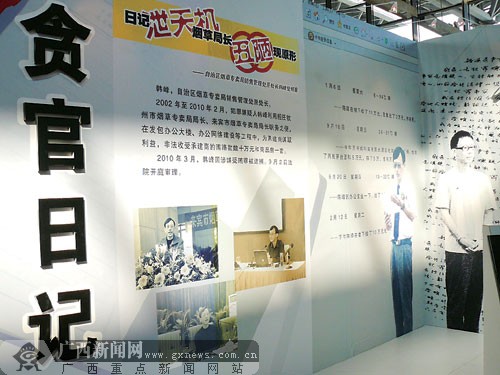 韓峰雖然只是一名處級干部,但他犯罪后卻能與昔日的廳級、省部級高官“同處一室”。不僅如此,昔日高官都被懸掛在展板上,多的是一兩張相片,少的寥寥幾句,韓峰卻獨占一席之地:展覽專門開辟一個展臺,以“貪官日記”為主題,展出韓峰受審和日記時間摘要等情況。此外,該展臺還獨享一臺液晶電視機,單獨播放韓峰懺悔、受審的情況。