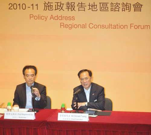 特區政府已分批約見多個政黨和團體,咨詢市民對施政報告的意見。首場咨詢會在科學館舉行,約有來自各區200名市民出席,但只有十多人向曾蔭權提問,大部人均關注民生議題,包括復建居屋的訴求。曾蔭權在開場白中表示,希望透過咨詢會聆聽大家在生活、學習、就業、營商等各方面的意見、憂慮和建議。他將在一周后動筆,希望在下月13日發表的《施政報告》能夠反映出各方面的意見。