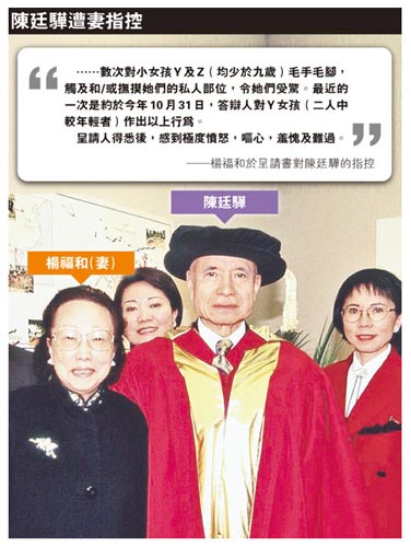 在楊福和控告次女之前,原來早于去年12月9日已向家事法庭提出離婚呈請。楊福和當時向法庭提出,丈夫于2004至2005年期間,曾經作出不合理行為(unreasonable behaviour),二人不能再共同生活。到今年10月2日,楊福和向法庭呈交補充資料,指陳廷驊曾經對身邊傭人及護士作出不當行為,令她憶起丈夫過去曾經不忠,楊福和更透過律師稱,陳廷驊曾摸兩名年僅8歲及5歲的曾孫女,楊感到羞恥,稱不能接受有關行為。
