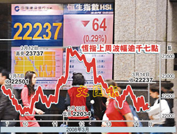 中新網3月17日電 據香港文匯報報道,受到貝爾斯登資金周轉不靈的消息拖累,美股大插近200點,一眾以美國預托證券(ADR)形式上市的港股也全線受挫。有香港證券界人士預計,18日港股將低開約500點,即下試今年低位21709點。