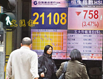 中新網(wǎng)3月21日電 據(jù)香港大公報報道,環(huán)球商品價格急跌,引發(fā)亞太區(qū)股市顯著回落,其間港股在金價油價商品股拖累下,收市時跌758點,是亞太區(qū)內(nèi)表現(xiàn)最差的市場。分析員指出,恒指50天線在周三已跌穿250天線,不少投資者會視之為“熊市”的確認(rèn)。