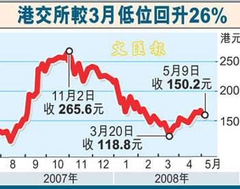 雖然獲利續增,但港交所亦面對不少困擾,包括新股上市減少、大市成交量萎縮等,投資銀行摩根士丹利上周五就調低港交所的投資評級,由“表現與大盤同步”降至“表現遜于大盤”,大削目標價43%至120元。