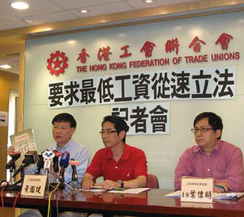 工資保障運(yùn)動(dòng)推行超過年半以來成效不彰,立法規(guī)管最低工資似乎勢(shì)在必行。工聯(lián)會(huì)理事長(zhǎng)黃國(guó)健、立法會(huì)議員王國(guó)興和權(quán)益委員會(huì)主任葉偉明9日一同召開記者會(huì),公布該會(huì)研究部就立法規(guī)管最低工資的研究結(jié)果。