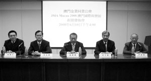 澳門金業(yè)同業(yè)公會會長藍鏵纓、理事長李子豐、副理事長高忠杰、監(jiān)事長謝耀宇及秘書長尹君樂主持10日舉行的新聞發(fā)布會。他們表示,過去澳門會展軟硬件設施不足,隨著拉斯韋加斯式綜合休閑度假理念延伸來澳,會展硬件條件已具備。與香港珠寶制造業(yè)商會合辦今屆國際珠寶展,希望借著跨地區(qū)合作吸收及學習他人的經(jīng)驗。