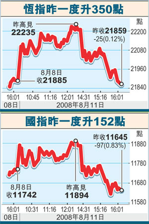 中新網(wǎng)8月12日電 據(jù)香港文匯報(bào)報(bào)道,受隔夜美股造好及內(nèi)地股市大挫影響,港股11日先升后跌,大市開市高開135點(diǎn),但午市受A股大跌逾5%影響,收市倒跌25.87點(diǎn),收報(bào)21859.34點(diǎn),成交總額僅575.90億元。市場人士指,市場關(guān)注內(nèi)地的通脹數(shù)據(jù),港股后市料反復(fù),恒指或下試21500點(diǎn)。