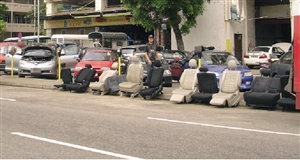 將座椅地氈?jǐn)[車頂、路邊,成修車行一帶新景觀。(圖片來源:澳門日報(bào))
